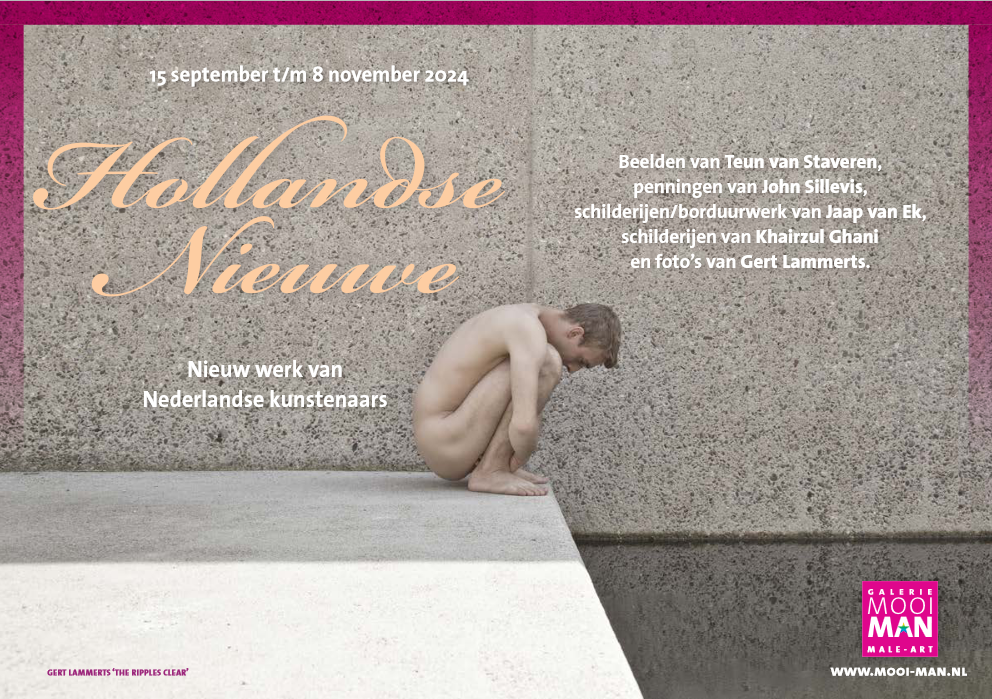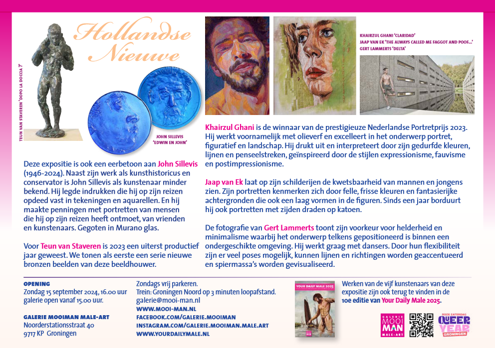 De expositie ‘Hollandse Nieuwe’ bij Galerie MooiMan, toont werk van vijf kunstenaars; beelden van Teun van Staveren, penningen van John Sillevis, schilderijen/borduurwerk van Jaap van Ek, schilderijen van Khairzul Ghani en foto’s van Gert Lammerts.